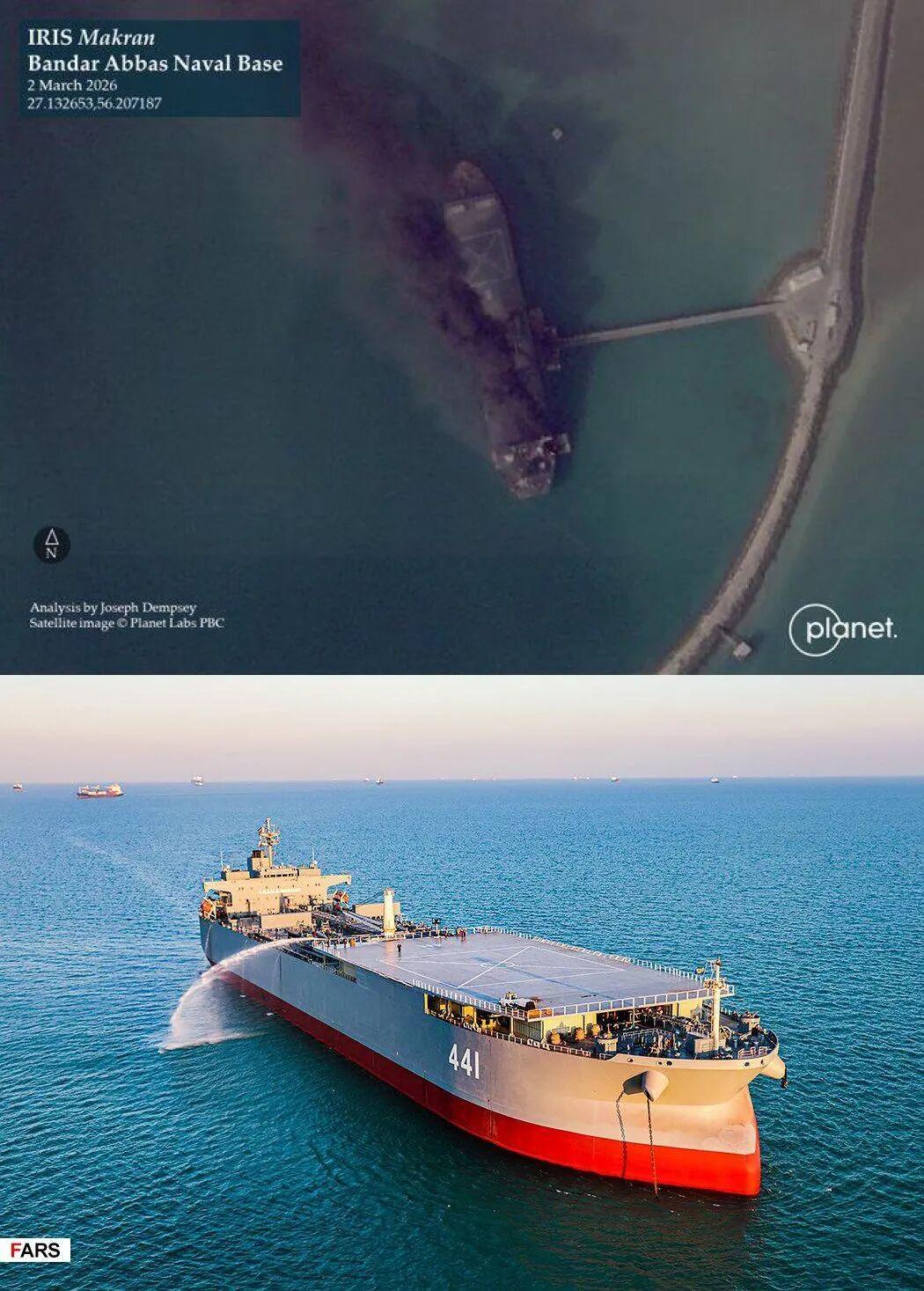 从遇袭后公布的卫星图来看,港内有多艘军舰起火,滚滚浓烟遮天蔽日。最引人注目的是停泊在远泊位的一艘巨轮。乍一看,这条巨轮宽大的船身和后置的舰桥让其看起来是一艘油轮,但实际上它是伊朗海军最大的舰艇,也是全世界排水量最大的军舰——“莫克兰”号前置基地舰。