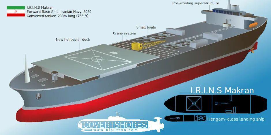 “莫克兰”号原本是一艘日本建造的原油油轮,2009年在日本住友重工船厂下水,2010年完工并交付迪拜一家公司运营,主要在中东-印度洋航线运输原油。分析指出,伊朗可能通过不透明的商业渠道购得该船。由于制裁,伊朗经常通过离岸空壳公司或不法商人购买商船,提供给伊朗海军/革命卫队改装成军用船只。“莫克兰”号是其中最大的一艘,满载排水量约121000吨,甚至超过美国的“福特”号航空母舰。伊朗海军对这艘油轮进行了军事化的改装,拆除部分油舱、加装大型直升机甲板、补给存储、快艇搭载位等,使其摇身一变,成为“前置基地舰”。